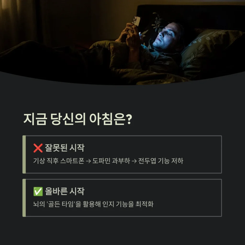 매일 아침 눈을 뜨자마자 습관적으로 스마트폰을 확인하며 하루를 시작하고 계신가요? 많은 현대인이 잠에서 깨자마자 도파민 과부하 상태로 하루를 시작합니다. 이는 뇌의 전두엽 기능을 저하시켜 정작 중요한 업무나 공부에 집중해야 할 때 에너지를 방전시키는 원인이 됩니다.